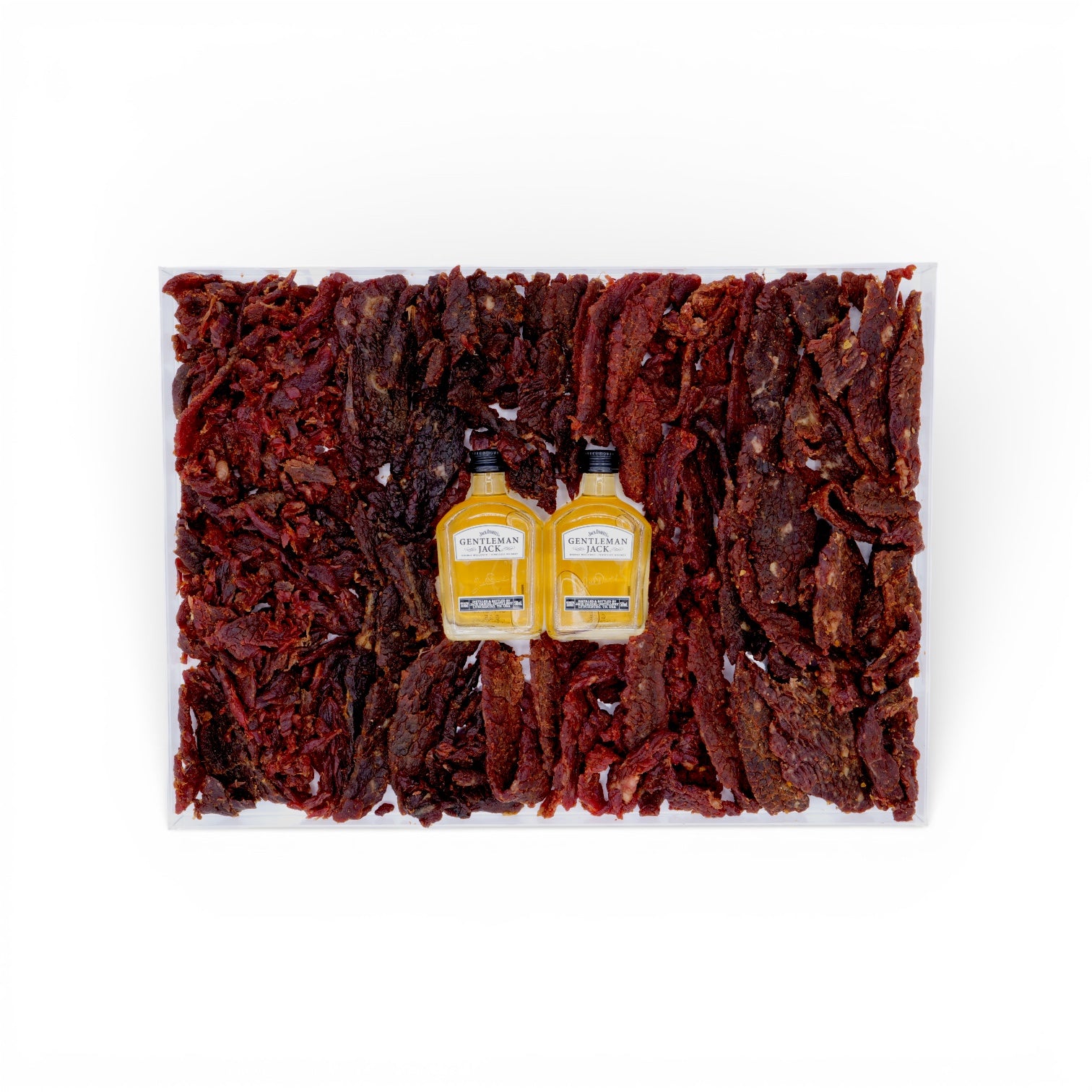 Elevate your gift-giving with this refined collection, thoughtfully curated on a sleek acrylic tray. This sophisticated set pairs approx. two pounds of premium assorted beef jerky—featuring an array of savory flavors and textures—with two 50ml bottles of Gentleman Jack whiskey, a smooth Tennessee whiskey known for its distinctive charcoal mellowing process. Perfect for the discerning palate, this combination offers a memorable tasting experience that balances rich, smoky notes with refined spirits. An ideal present for whiskey enthusiasts, jerky lovers, or anyone who appreciates curated indulgence.