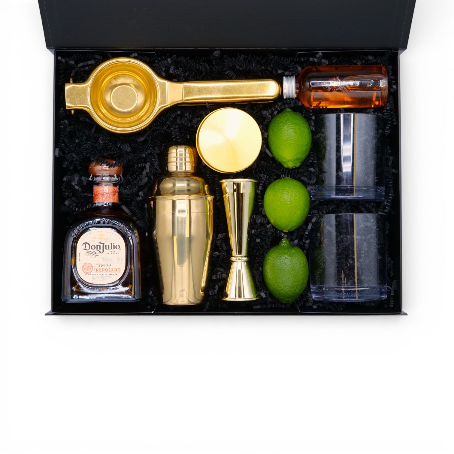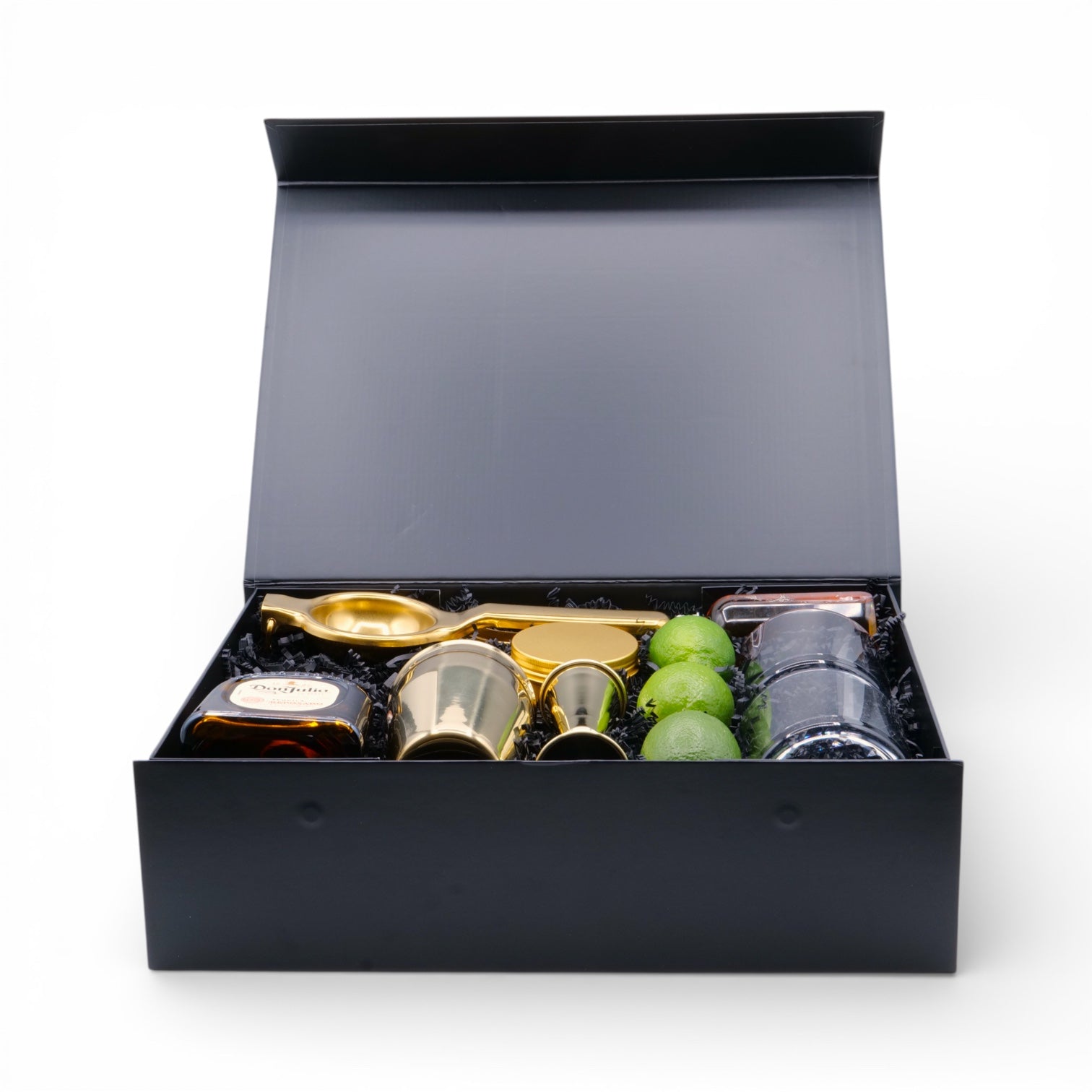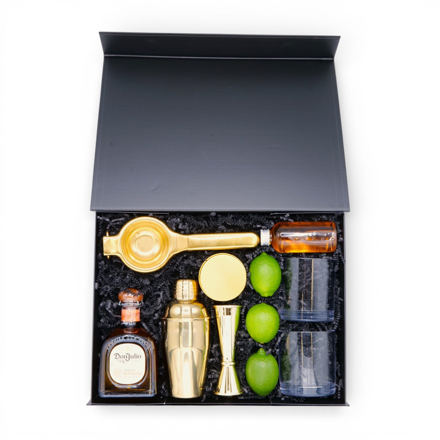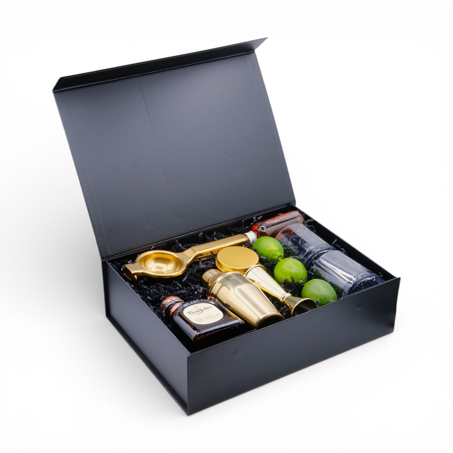 Master the art of the perfect margarita with everything bundled in one stunning magnetic gift box. This kit features a 375ml bottle of Don Julio Reposado Tequila, fresh limes, a citrus squeezer, cocktail shaker, measured jigger, rocks glasses, agave nectar, and dehydrated lime garnish for that finishing touch. Ready to impress guests or treat yourself to bar-quality drinks at home. Plus, customize it with your logo to make it truly yours—the ultimate gift for tequila lovers and cocktail enthusiasts alike.
