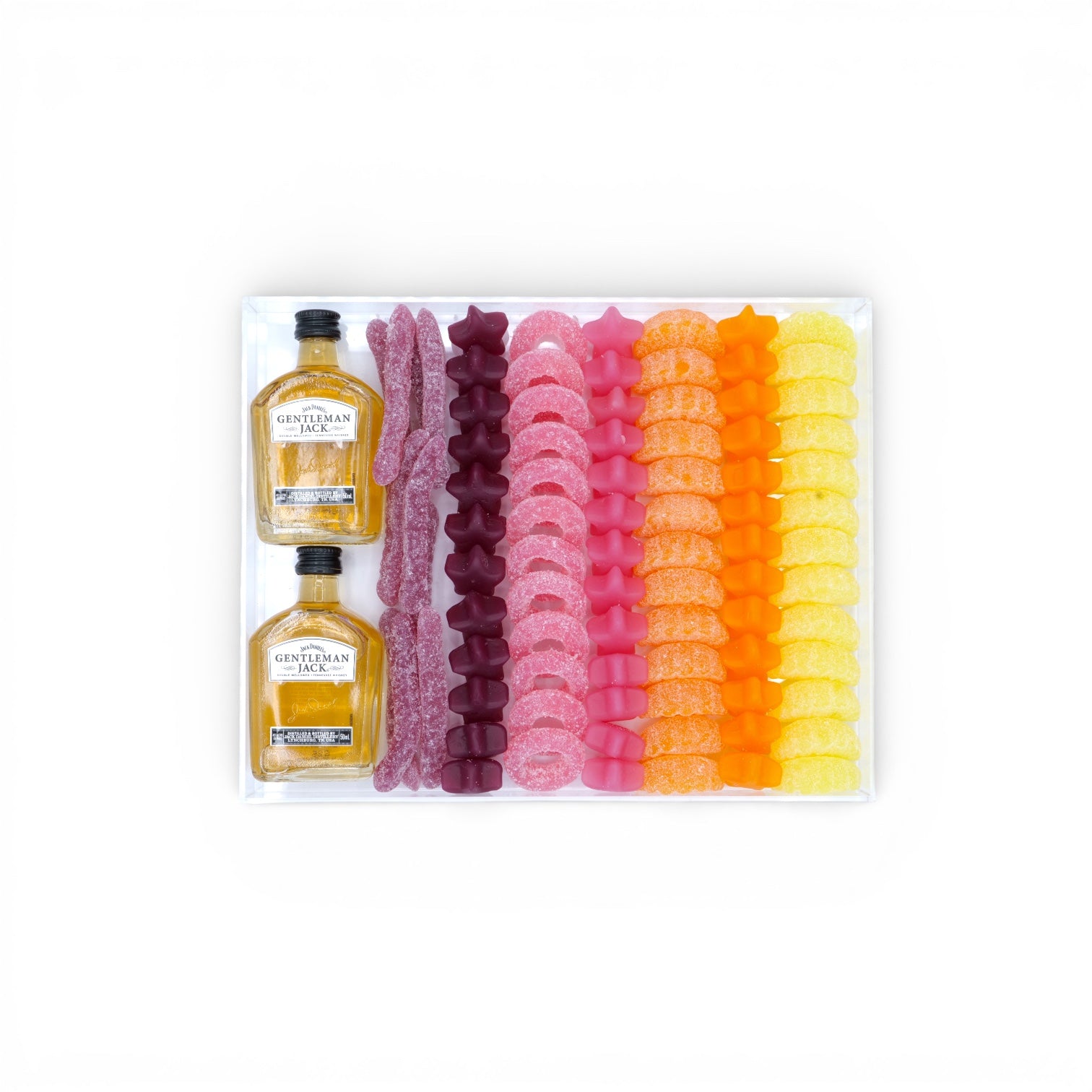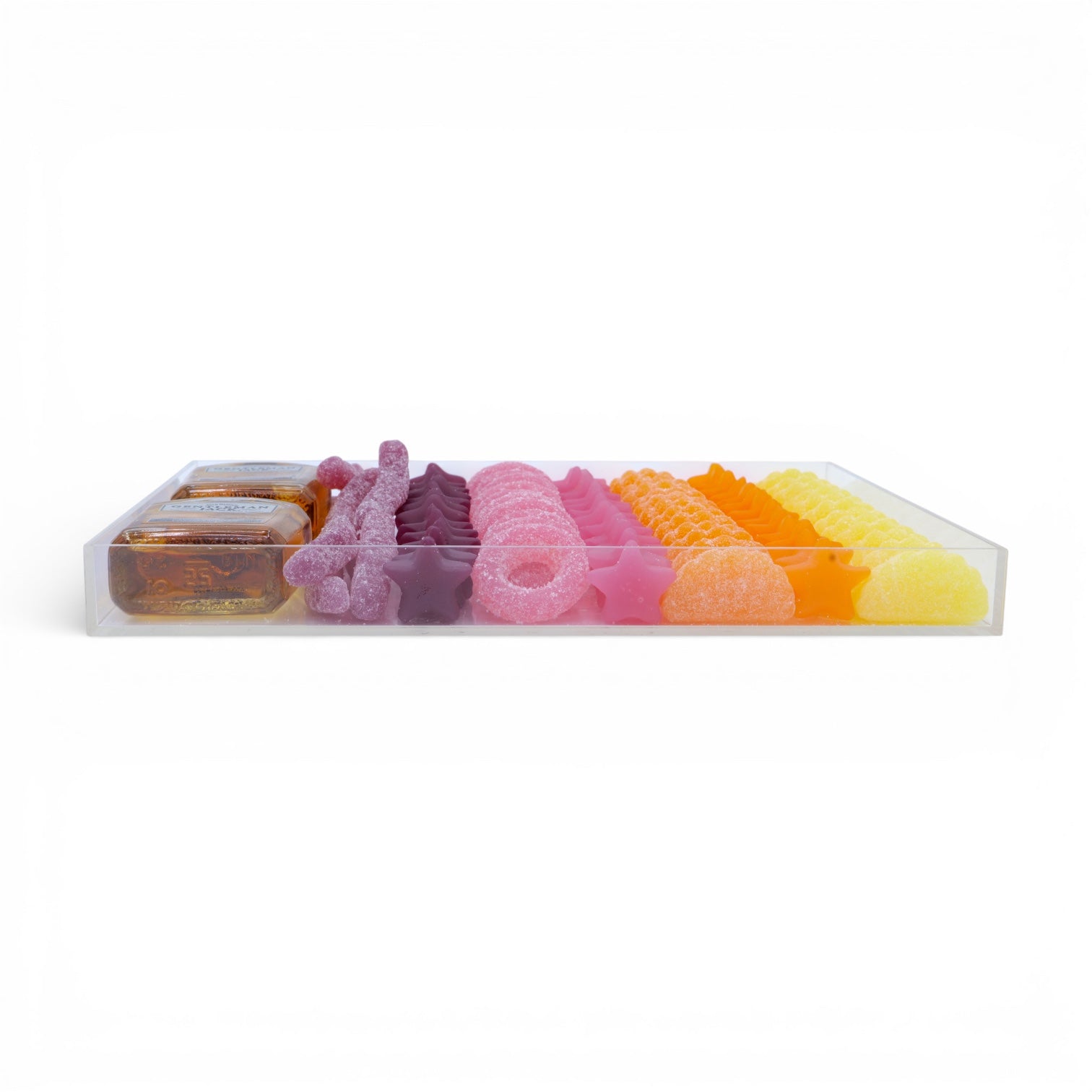 Treat your crew to something special with our Medium Candy Board—a vibrant acrylic tray brimming with over a pound of guilt-free gummy candies (all dye-free!) paired with two smooth 50ml bottles of Gentleman Jack whiskey. Whether you're sharing with family or friends, this combo delivers the perfect balance of sweet indulgence and sophisticated sipping.
