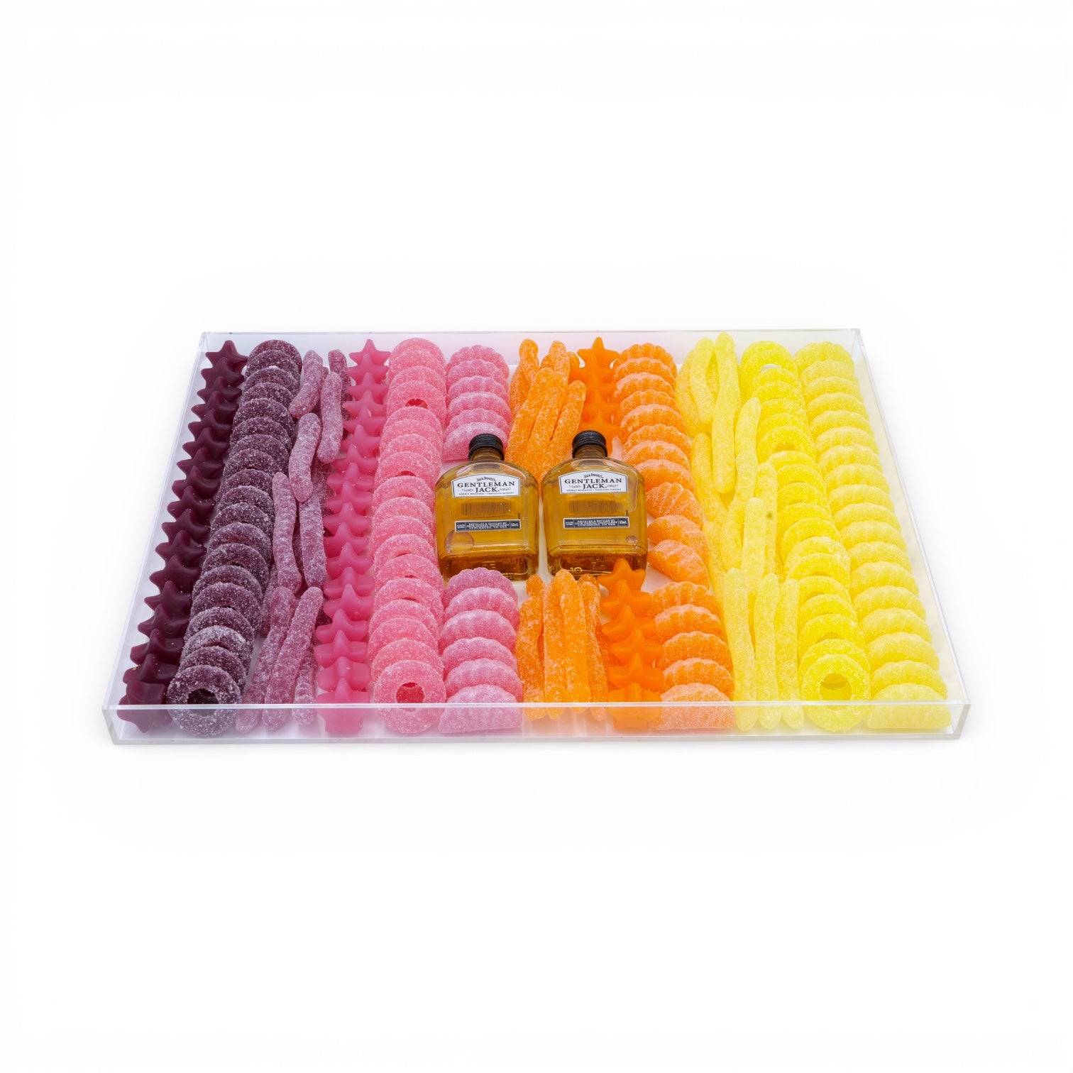Treat your crew to something special with our Large Candy Board—a vibrant acrylic tray brimming with over two pounds of guilt-free gummy candies (all dye-free!) paired with two smooth 50ml bottles of Gentleman Jack whiskey. Whether you're sharing with family or friends, this combo delivers the perfect balance of sweet indulgence and sophisticated sipping.